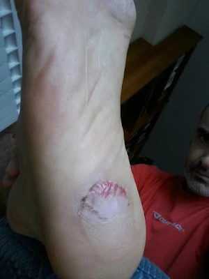 The descent to Saint-Gervais offers me 828 m in 7 km. “Kind of steep”, I think, especially when we enter the ski slopes and the soil unevenness increases. There I try to release the brakes to avoid forcing my quadriceps. Strangely, I begin to feel my heels progressively heating up to the limit of unbearable pain and the distinct sensation of a bubble slowly forming under both feet… growing insidiously… nausea! Bad! It is rare for me to form blisters and never in this region of the foot. What's wrong with me?!! (new socks, rookie mistake...) Every time I put my foot down, it's as if a Roman centurion was driving a nail into my heel. I feel it exploding inside the bone. I'm defending myself the best I can. I step mainly on the forefoot, which is not easy when going down.